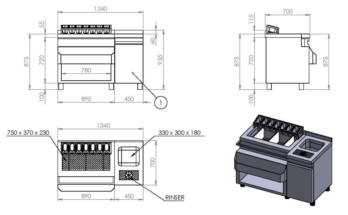Cocktail bar station including sink, glass rinser, GN containers and speedrail for bottles