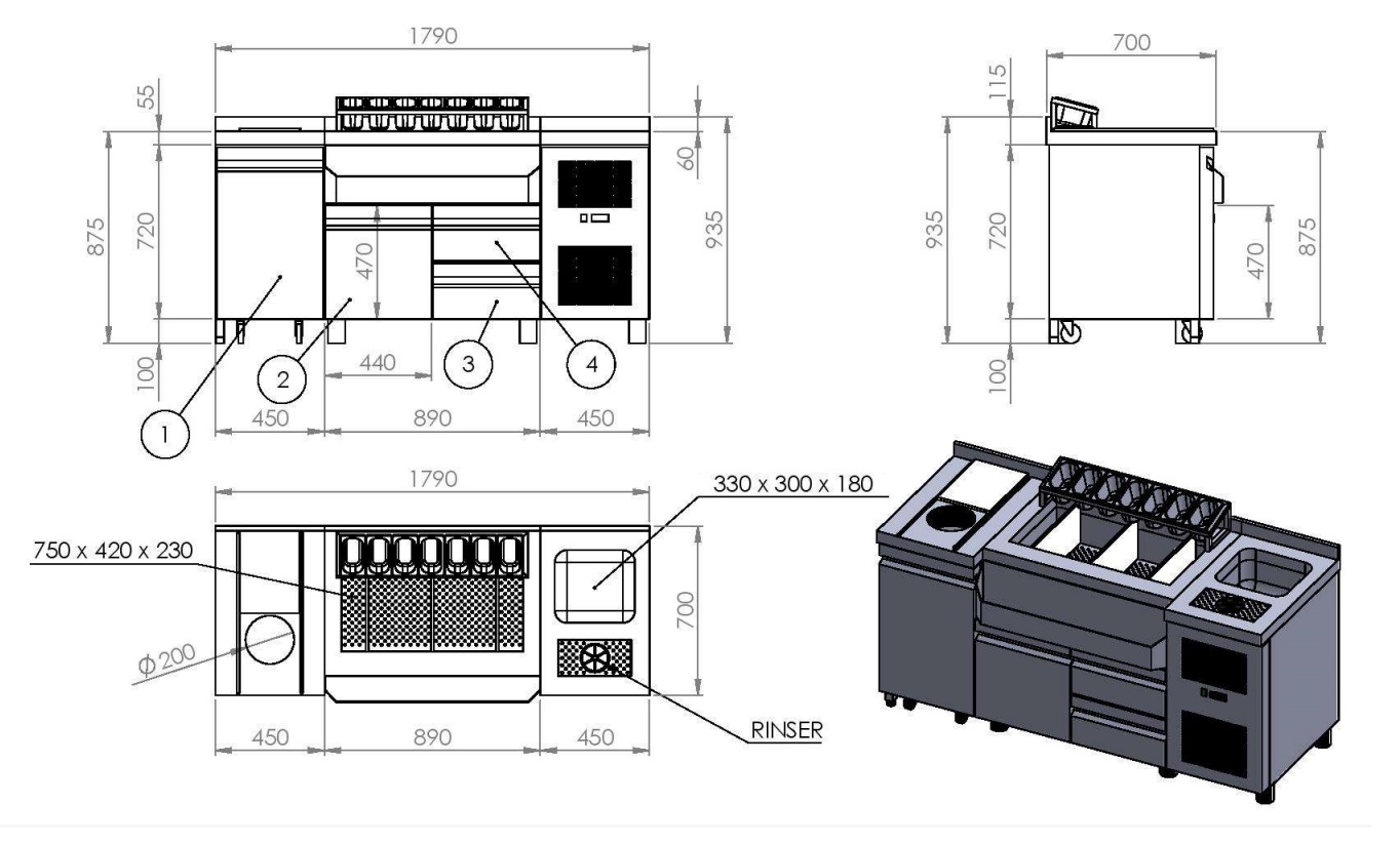 - Complete bar equipment: including sink, glass rinser, GN compartments, speed rail for bottles, and insulated ice compartments