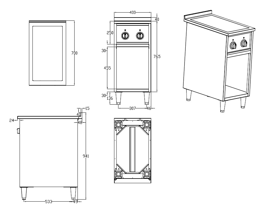 Matmenys: 400x700x941 mm (PxGxA) – Įtampa: 400V – Galia: 2 x 3,5 kW – Svoris: 49 kg.