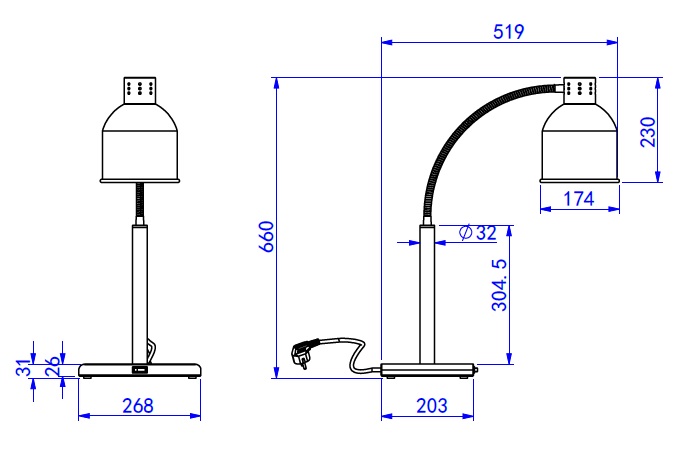 Pristatome mūsų šildymo lempą – būtiną priedą bet kuriai profesionaliai virtuvei ir viešojo maitinimo įstaigai. Kompaktiška ir tvirta lempa pagaminta iš geležies, užtikrinančios ilgaamžiškumą ir stabilią konstrukciją. Galinga lempa efektyviai paskirsto šilumą, todėl puikiai tinka palaikyti optimalią patiekalų, nuo užkandžių iki desertų, patiekimo temperatūrą, išsaugant jų šviežumą ir skonį. Matmenys: 268x203x660 mm (IxPxA) – galingumas 0,25 kW – svoris 5,5 kg.