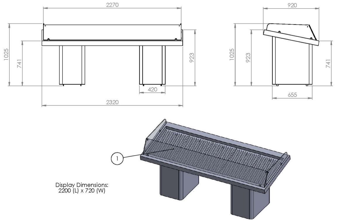 „Combisteel“ savitarnos žuvies vitrina 2.3 idealiai tinka greitam, į klientą orientuotam šviežios žuvies pristatymui. Jos atviras dizainas leidžia klientams tiesiogiai prieiti, o galinėje dalyje esančios stumdomos organinio stiklo durys palengvina prekių papildymą. Pagaminta iš higieniško, korozijai atsparaus AISI 304 nerūdijančio plieno, įrenginys pasižymi ypač dideliu 220×72 cm ekspozicijos plotu. Šis modelis neturi šaldymo sistemos, todėl puikiai tinka trumpalaikiam eksponavimui didelio srauto aplinkoje, kurioje dažnai papildomos prekės. Matmenys: 2320x920x920 mm (IxGxA) – Svoris: 115 kg.